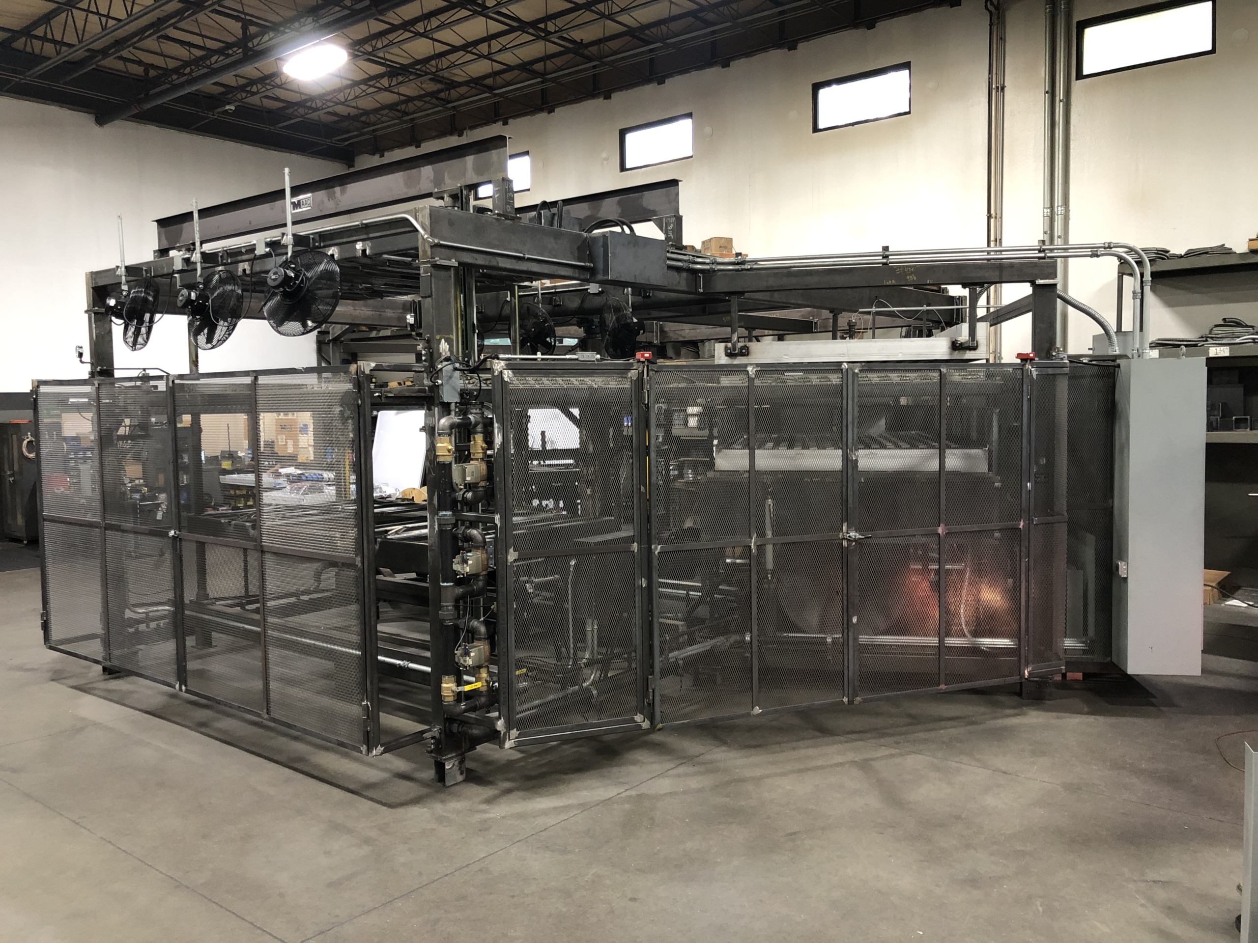 MAAC Machinery’s “In-Stock” Comet Model C105R3 is a 120” x 72” maximum mold size, three station rotary thermoforming machine equipped with variable speed programmable platens (30” stroke top/50” stroke bottom), quartz upper & quartz lower ovens and an electric sheet car index. Additional features include Allen Bradley PLC controls, adjustable clamp frames, 90 independent oven zones (45 zones per oven half), safety/sag eye in the lower oven, oversized vacuum tank and high velocity cooling fans.